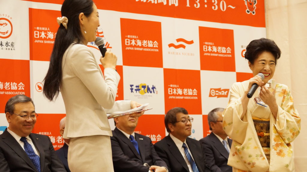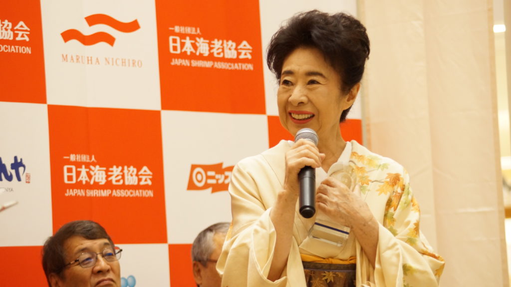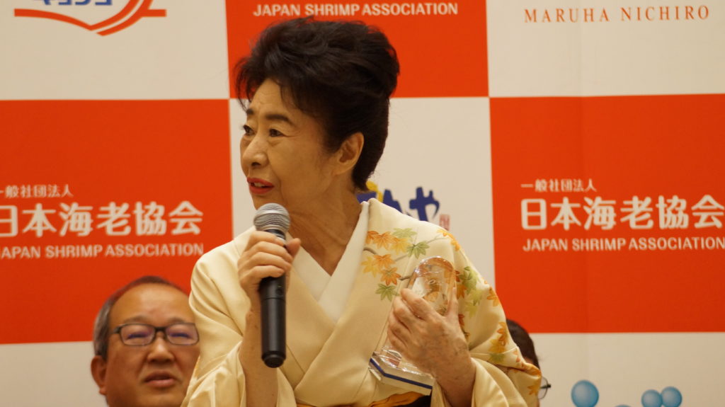 秋の紅葉をあしらった着物に身を包み髪結い姿で出席した中村玉緒は、76歳となった今でも大の海老好きで、天ぷら店では最低でも20匹以上の海老の天ぷらを平らげるというエピソードを披露し、会場を驚かせた。また、一般社団法人日本海老協会から贈られた1年分の海老を美味しく食べるためにも、今後も健康で元気に過ごしたいとの決意を語った。授賞式後、中村玉緒と戸井和久社長は、グランツリー武蔵小杉内のイトーヨーカドーの食品売場に移動し、「海老を食べて元気に長生きキャンペーン!!」中の試食コーナーで、ハワイの定番ガーリックシュリンプや、海老の寿司や太巻き寿司を美味しそうに食べ歩き、来店者の注目を集めた。